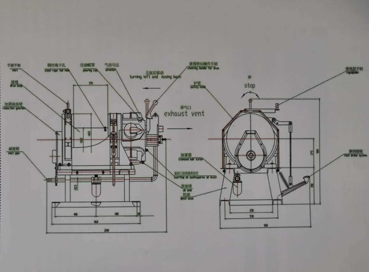 JQHS70x10氣動絞車,通過二級齒輪減速,把扭矩傳給滾筒。采用壓縮空氣為動力,推動TMHI7活塞式氣動馬達工作。氣動絞車的操縱,是靠馬達體上的手操縱轉向閥實現(xiàn)正轉、反轉、停止等項動作。該氣動絞車還具有手、腳雙重剎車功能,為了保證氣動絞車的安全性。適合于建筑工程、礦山以及海上、陸地油田鉆井平臺上使用。